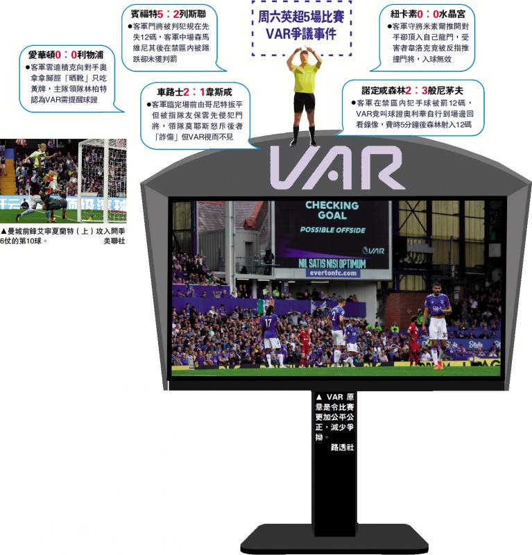 视频助理裁判(VAR)又成为英超比赛日的“主角”,上周六的8仗中竟有5仗在赛后惹来争议,事情性质包括判断双重标准、未有尽责提点球证、没有明察秋毫、无能力作出最终判决等,不利一方的球队亦皆只能打和或落败,赛后固然要大发牢骚。球赛引进VAR原意是令比赛更加公平、公正,减少争拗,但在英超似乎仍然未能有效发挥功能,亦难怪本届世界杯,VAR中并没有英格兰的球证团队。\大公报记者 谭德龙