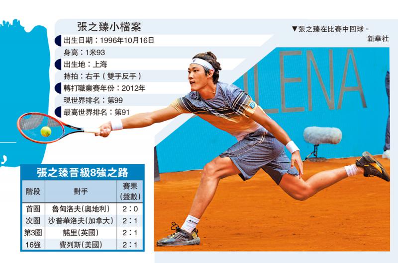 【大公报讯】据新华社报道:又一次逆风翻盘,又一次创造历史!在2日马德里网球公开赛男单16强的比赛中,张之臻以盘数2:1的总比分,逆转8号种子美国的费列斯,成为历史上首位挺进大师赛8强的中国大陆男网选手。(NOW636台今晚7时直播赛事)