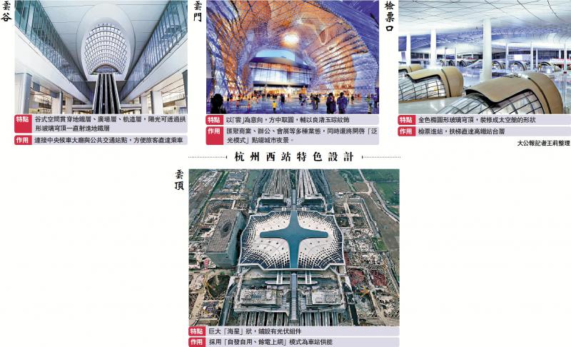 经过两年多的建设,总投资达72亿元人民币的杭州西站已基本建成。根据“云之城”的设计理念,这座“超级高铁站”从空中远观仿佛一朵巨云,还打造了“云门”“云谷”“云路”“云厅”等设施,富有科技感。据悉,杭州西站将在合杭高铁湖杭段建成通车时投入使用,预计最快本月即可开通。候车厅顶部“海星”状的“云顶”光伏发电供能,金色拱门设计的检票口就像是隐藏在云层里的“太空舱”,营造“云端”梦幻出行崭新体验。\大公报记者 王莉