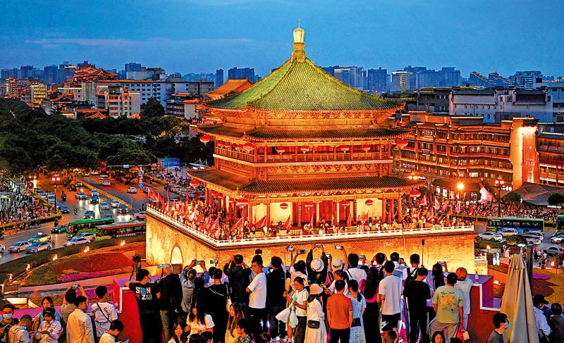 图:5月2日,在陕西西安,游客在观景平台欣赏锺楼夜景。\新华社