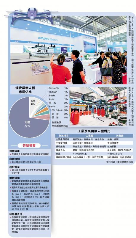 【大公报讯】综合新华社、中通社、观察者网、环球时报报道:7月31日,中国商务部、海关总署、国家国防科工局、中央军委装备发展部联合发布了关于无人机出口管制的两个公告,分别对部分无人机专用发动机、重要载荷、无线电通信设备和民用反无人机系统等实施出口管制,对部分消费级无人机实施为期2年的临时出口管制,同时,禁止其他未列入管制的所有民用无人机出口用于军事目的。值得注意的是,最大续航时间大于等于30分钟、空机重量大于4KG等机款纳入监管。上述政策将于9月1日起正式施行。此前,中方已经向有关国家和地区作了通报。