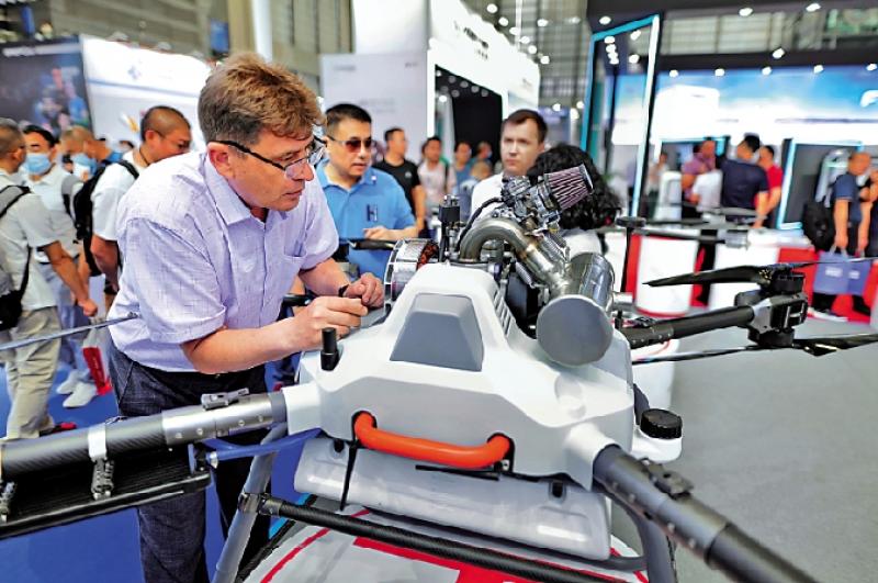 图:外商在深圳展会上关注广州华科尔QL2000油电混合无人机。 中新社