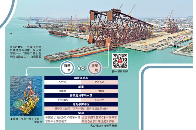 图:3月12日,中国自主设计建造的亚洲第一深水导管架─“海基二号”在珠海建造完工。\央视截图