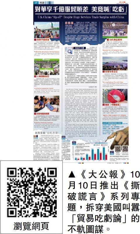 图:《大公报》10月10日推出《撕破谎言》系列专题,拆穿美国叫嚣“贸易吃亏论”的不轨图谋。