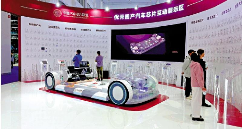 图:北京举行的世界智能网联汽车大会,设有“中国芯”展区,展示千余款国产汽车芯片。\大公报记者郭瀚林摄