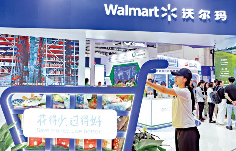 图:第三届中国国际供应链促进博览会公众开放日期间,观众参观沃尔玛展台。\新华社