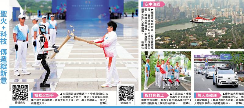 从深海采集的“源火”,到四城传递“圣火”,深圳站和广州站应用了智能机器人、无人驾驶汽车、低空飞行器等进行火炬传递或串联路段,凸显粤港澳大湾区作为国际科技创新中心的产业优势,展示科技与体育的深度融合。\大公报记者 胡永爱、李薇、帅诚报道