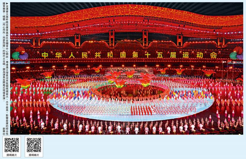 水舞台构筑“同心圆”,演出分成“同根同源、同心同缘、同梦同圆”三大篇章,众多极具标志性与经典性的岭南文化元素,首次登上全运会舞台,它们代表岭南、代表粤港澳、代表大湾区,向全世界讲述一个关于传承与发展的湾区故事、中国故事,既展现了大湾区的蓬勃活力与炽热激情,更书写了粤港澳同心聚力圆梦的崭新篇章。\大公报记者 黄宝仪、敖敏辉、卢静怡、胡若璋、李紫妍广州报道