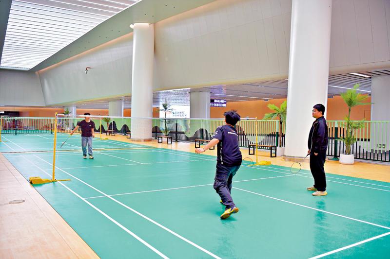 图:深圳依托发达的轨道交通网络,在地铁枢纽内盘活闲置空间,打造出一批运动场馆。图为市民在黄木岗地铁站运动馆内的羽毛球场打球。\大公报记者郭若溪摄