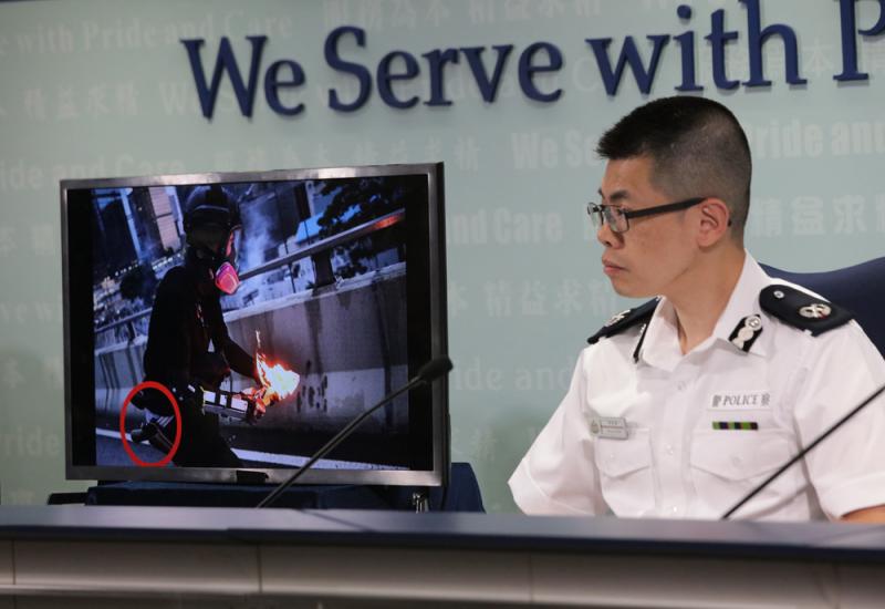 图:警方重申,佩枪掷汽油弹者并非警务人员 大公报记者摄