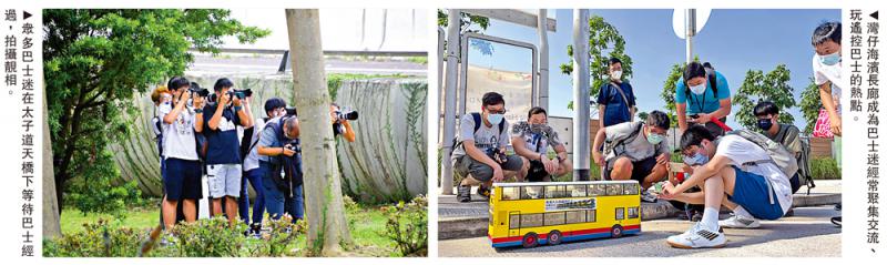 左图:众多巴士迷在太子道天桥下等待巴士经过,拍摄靓相。右图:湾仔海滨长廊成为巴士迷经常聚集交流、玩遥控巴士的热点。