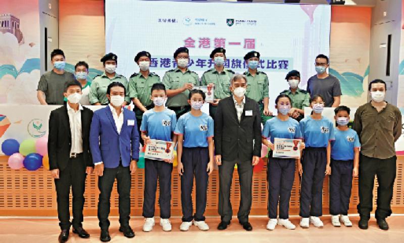 图:团体首办青少年升国旗仪式比赛,旨在培养香港青少年爱国爱港情怀。图为中学及小学组冠军学校学生及嘉宾合影。