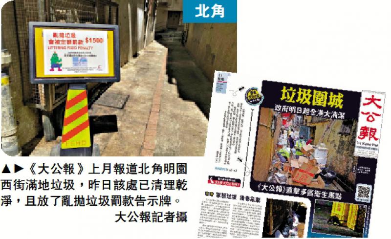 图:《大公报》上月报道北角明园西街满地垃圾,昨日该处已清理干净,且放了乱抛垃圾罚款告示牌。\大公报记者摄