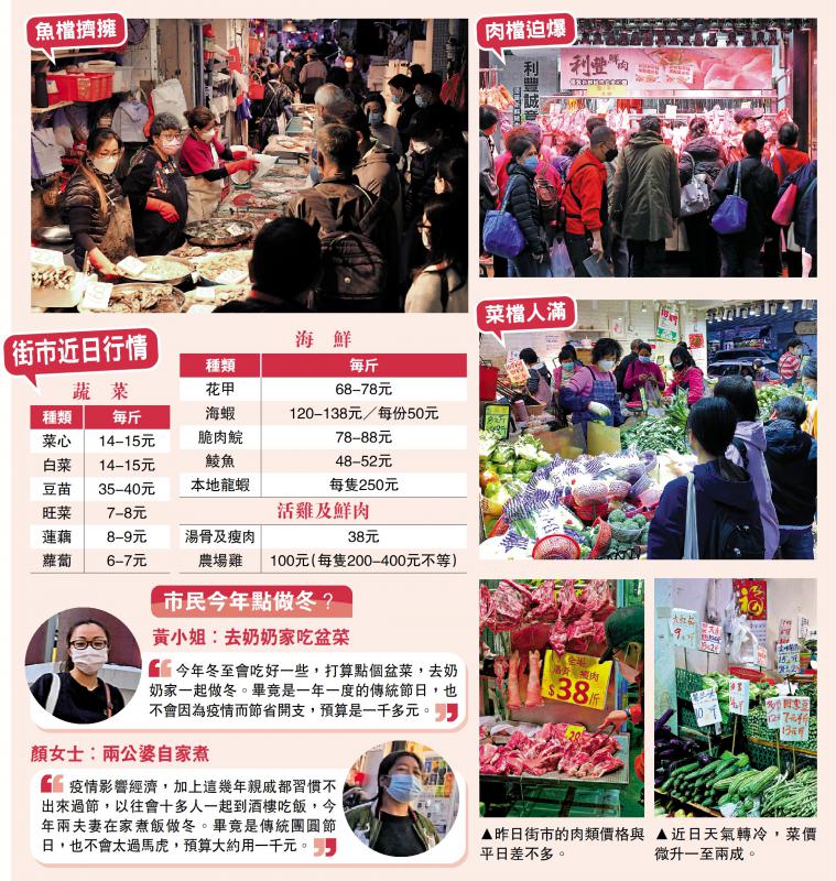 今日冬至,家家户户团圆做冬,不少主妇会到街市“扫货”,煮一餐美食,近日天气冷,影响蔬菜供应,菜价微升一至两成,但价钱尚算合理;至于肉食和海鲜供应充足,未见大幅起价,活鸡每斤100元,一只三至四斤的肥鸡盛惠300至400元。