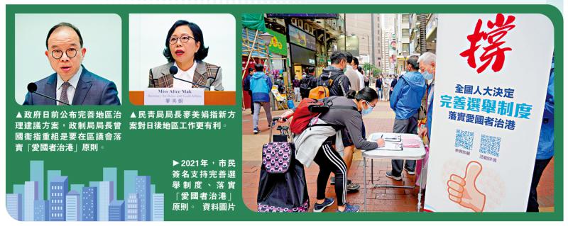 左图:政府日前公布完善地区治理建议方案,政制局局长曾国卫指重组是要在区议会落实“爱国者治港”原则。中图:民青局局长麦美娟指新方案对日后地区工作更有利。右图:2021年,市民签名支持完善选举制度、落实“爱国者治港”原则。\资料图片