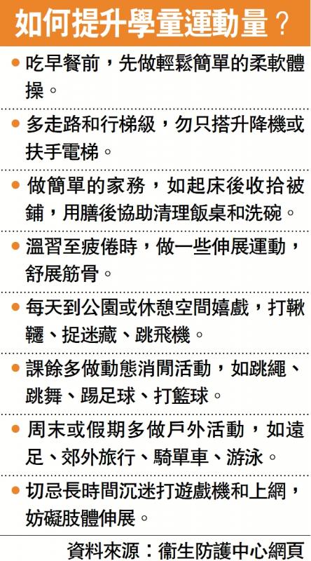 WHO指出,中等强度和高强度的身体活动,可增进健康。常见的活动方式包括走路、骑脚踏车、体育运动、玩游戏等。