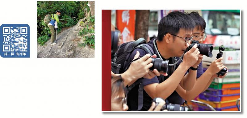 左图:为了影得一张独家照片,大公报记者攀山寻觅最佳位置。 ;右图:大公报记者昨日马不停蹄,到不同地区采访区选活动。