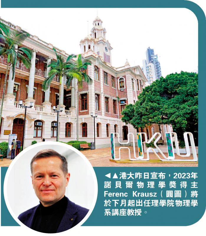 图:港大昨日宣布,2023年诺贝尔物理学奖得主Ferenc Krausz(圆图)将于下月起出任理学院物理学系讲座教授。