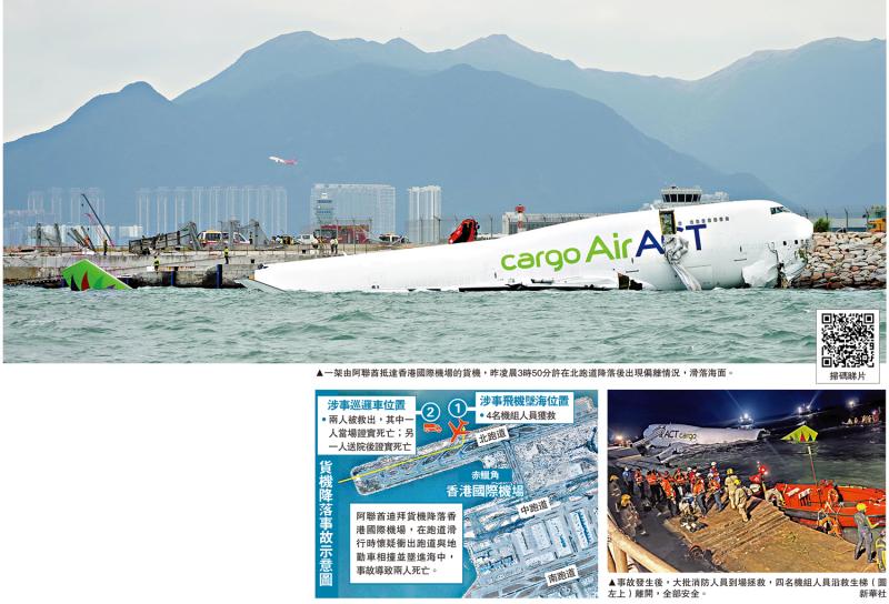 香港国际机场昨日(20日)发生货机冲落海罕见意外。一架由阿联酋阿勒马克图姆国际机场抵港货机,在机场北跑道降落后突转左滑出跑道撞到一辆巡逻车,继而双双坠海,巡逻车上一名40岁男司机及一名30岁男乘客死亡,货机上四名机组人员没有受伤。