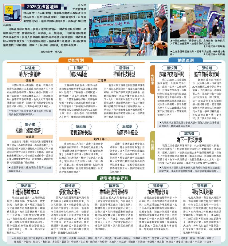 地区直选报名方面,参选人针对地区情况,关注解决民生问题,政纲内容致力提升当区居民的“幸福感”与“获得感”;功能界别与选委界别竞争激烈,参选人更强调自身跨界经历等多元竞争优势,关注香港融入国家发展大局、北都规划与建设、金融产业升级转型、创科发展等议题并提出切实建议,展现了“拚政纲、拚实绩”的选举新气象。\大公报记者 陆九如