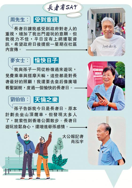 周先生:长者日让我感受到政府对老人的重视,增加了我出门游玩的意愿。但我视力不佳,平日没有上网获取资讯,希望政府日后提前一星期在社区内宣传。