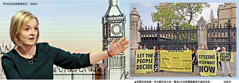 左图:特拉斯胜选机会更大。\法新社 右图:英国深陷危机,保守党民望大跌,图为2日在英国议会前示威的民众。\法新社