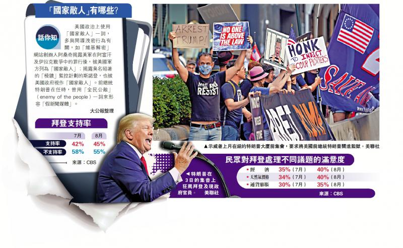【大公报讯】综合BBC、《华盛顿邮报》、《国会山报》报道:美国中期选举临近,民主党和共和党相互攻击升级。在美国总统拜登猛轰前总统特朗普危害国家后,特朗普3日在宾夕法尼亚州出席拉票活动时反击,批评拜登是“国家的敌人”(enemy of the state)。这是FBI上月突袭佛州海湖庄园后,特朗普首次出席公开集会。特朗普表示,FBI的搜查是“美国历史上最令人震惊的滥用职权行为之一”,更表示“我们的国家要下地狱了。”