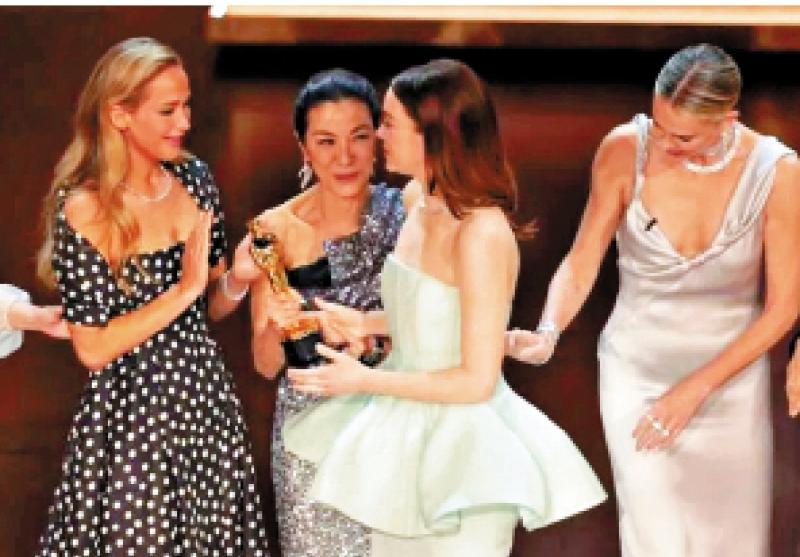 图:获“最佳女主角”奖的爱玛史东被指不愿从杨紫琼手上接过奖杯。/网络图片
