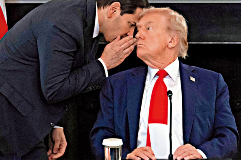 图:鲁比奥(左)8日递给特朗普一张纸条。\法新社