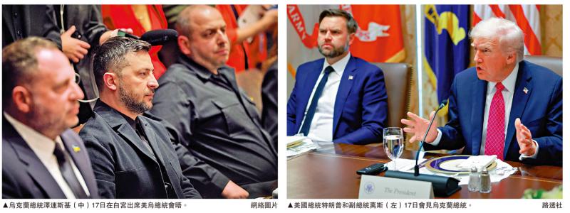 左图:乌克兰总统泽连斯基(中)17日在白宫出席美乌总统会晤。\网络图片;右图:美国总统特朗普和副总统万斯(左)17日会见乌克兰总统。\路透社