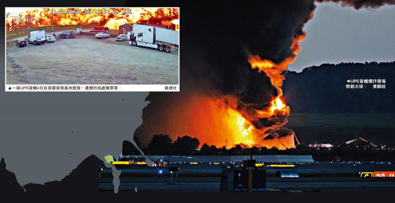 左图:一架UPS货机4日在美国肯塔基州坠毁,浓烟烈焰直冲云霄。\路透社;右图:UPS货机爆炸现场燃起火球。\美联社