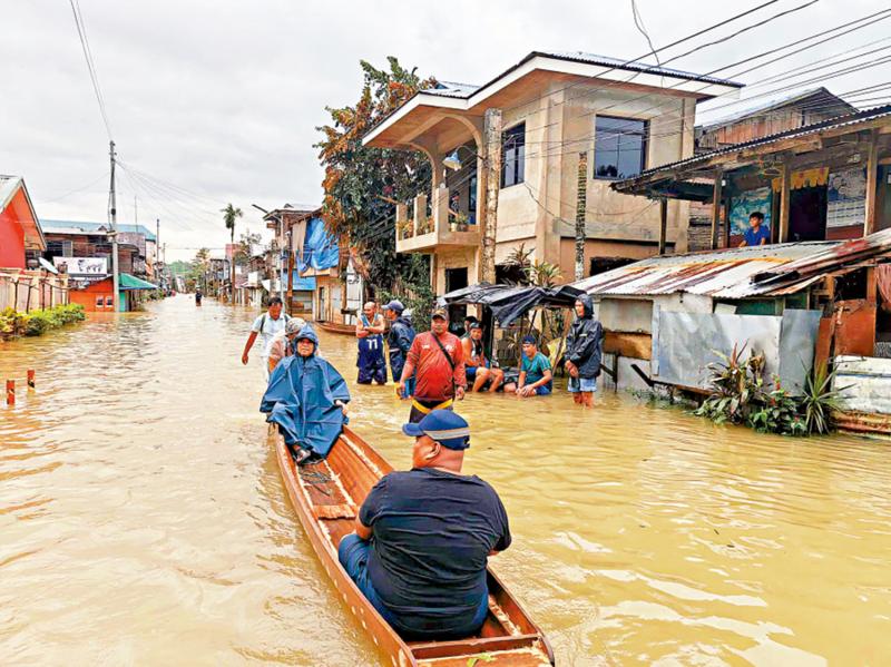 图:菲律宾东萨马省的市政官员9日乘船视察被暴雨淹没的街道。\法新社