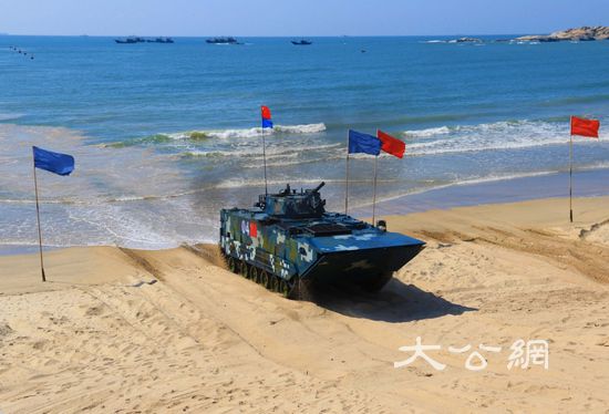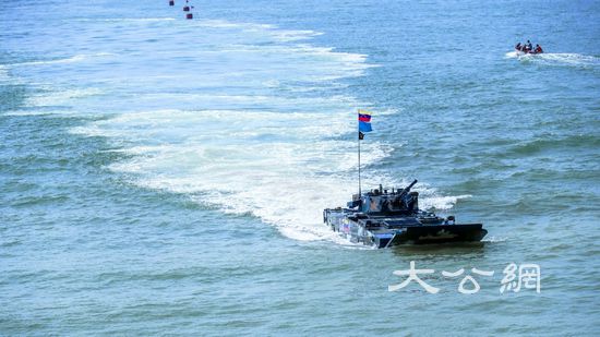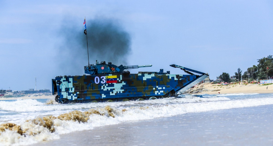 委内瑞拉参赛队驾驶战车冲滩登陆。(孙宏韬摄)