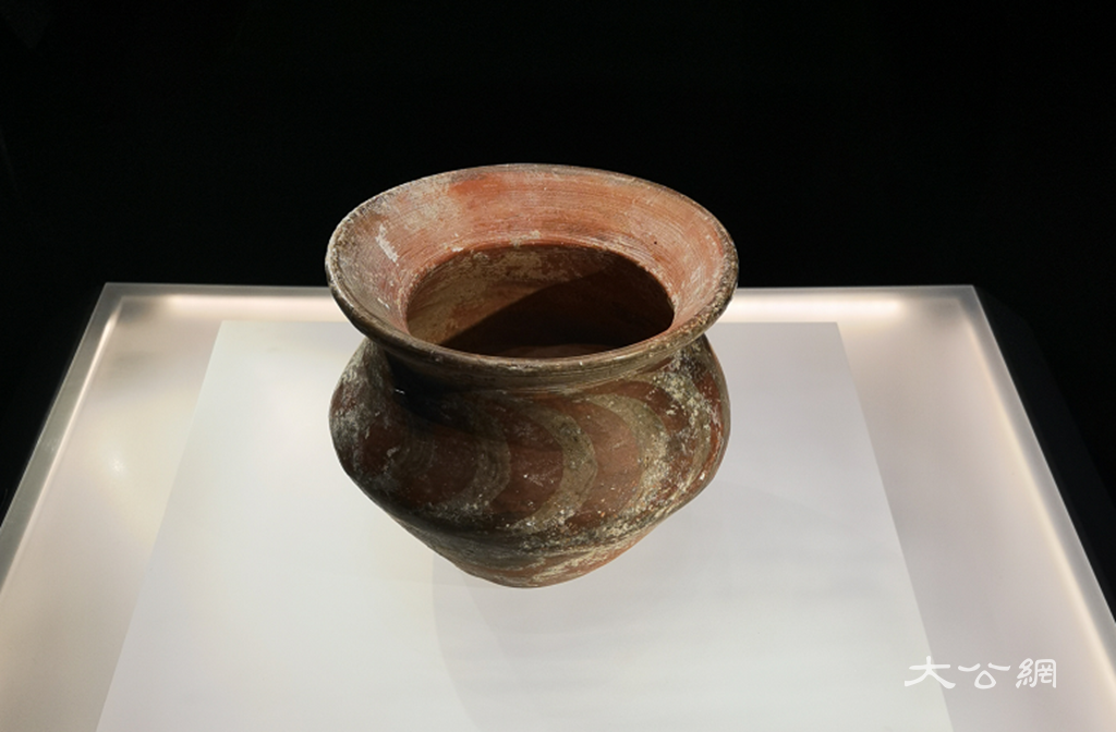 弧线三角纹彩陶盆是庙子沟遗址第二次发掘中出土的最完整的一件,属于一件泥,器壁内外均涂红衣,打磨的非常光滑,上腹部有非常明显的圆点、红线和三角线纹的纹饰,这些纹饰是庙底沟时期先民们常用到的一系列母体元素。他们以这些母体纹样为根本,将它们变换成多组的彩陶纹饰,绘制在陶器之上,这个纹饰虽然很简单,却是庙底沟时期必不可少的母体纹样。