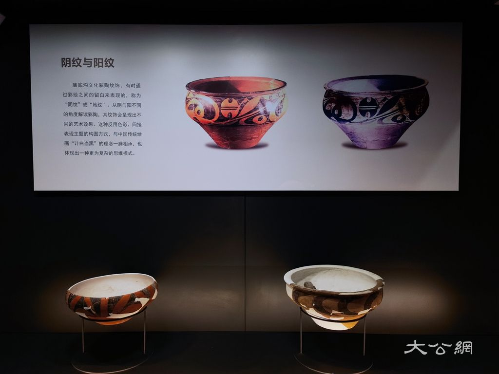 上面这件彩陶盆,并不是直接以黑彩来展现纹饰内容,而是反用色彩、以黑彩作为底衬,通过露出来的陶器底色来展现纹饰内容,这种构图方式被成为阴文。阴文和阳文两种构图方式不一样,这种反用色彩其实是中国传统绘画当中的一种复字手法,在6000年前先民们就已经会使用了,说明当时浓厚的艺术氛围、高超的逻辑思维能力。
