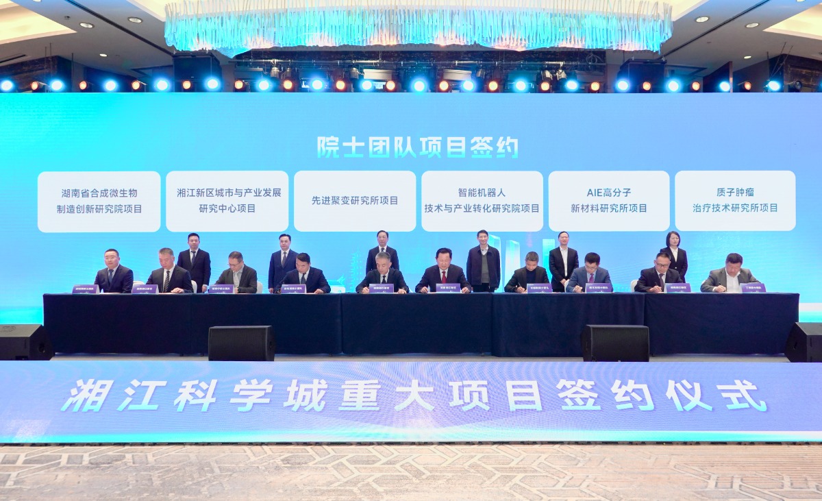 翻开签约项目信息,可以发现“科学端”与“产业端”无缝对接非常明显。据统计,本次签约中共有6个院士团队项目——彭先觉院士团队的先进聚变研究所、王耀南院士团队的智能机器人技术与产业转化研究院、程泰宁院士团队的城市与产业发展研究中心、唐本忠院士团队的AIE高分子新材料研究所、邱冠周院士团队的合成微生物制造创新研究院、丁洪院士、王秋良院士团队的质子肿瘤治疗技术研究所,让人切实感受到湘江新区科技创新浪潮的澎湃与震撼。