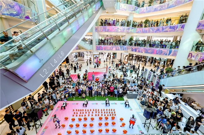 科技风潮席卷商业空间,智能竞技唤醒消费活力。“北京apm AI运动会”竞技表演核心区设于北京apm 首层中庭,这里以“每日4场舞台表演”为核心节奏,100个迷你机器人领衔,以整齐划一的动感舞姿、精准操控的高难度动作,将科技与运动的融合之美直观呈现,瞬间点燃现场氛围。