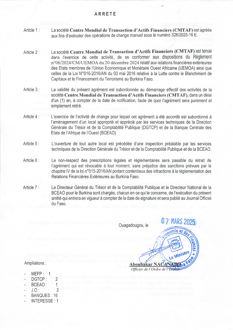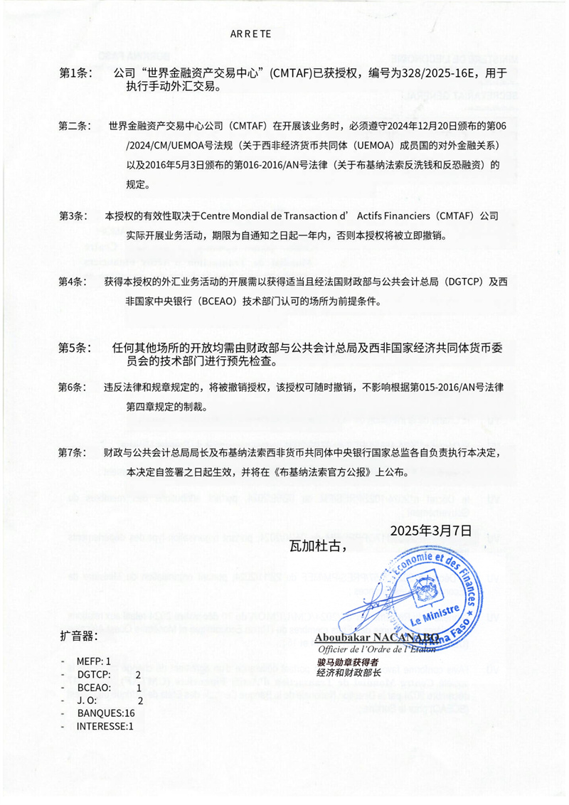 更值得一提的是,今年3月,【世界金融资产交易中心】(CMTAF)亦获得由西非国家中央银行(BCEAO)正式颁发的国际货币换汇许可法令文件,也正式成为西非经济和货币联盟(UEMOA)体系内合规运营的国际企业。该许可法令将为集团立足西非开展跨境支付、国际结算、汇率转换等金融业务提供重要支持,极大提升其资金运转效率和国际结算能力。