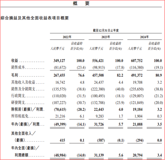药物管线的拓展与销量的增加,表现为公司业绩的快速增长。具体来看,公司的营业收益从2022年的人民币3.49亿元增长至2024年的人民币6.08亿元,年复合增长率达31.9%;同期毛利由人民币2.68亿元提升至4.91亿元,盈利能力持续增强。2023年及2024年,公司分别实现利润人民币0.32亿元及0.21亿元;2025年前三个月利润达0.13亿元,净利润率升至9.4%,体现出良好的成本控制与运营效率。