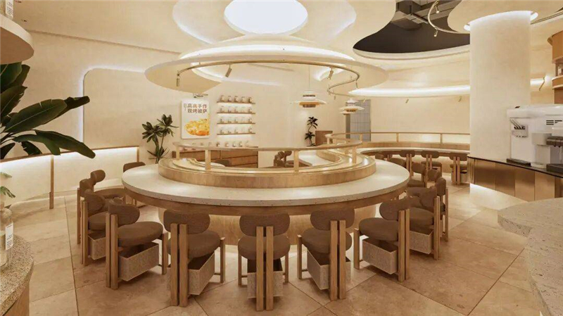 比如,在门店模型上,它不断迭代更新,像长沙龙湖芙蓉天街店不仅采用木质色调、S形餐台的设计风格,还精心布置了展示柜台,提升顾客用餐体验的同时,整体视觉效果也更高级。