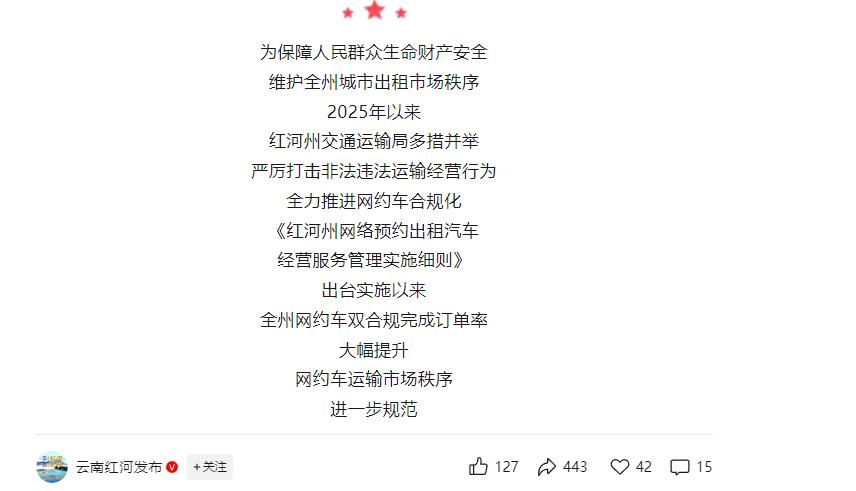 下一步,红河州交通运输局将联合公安等部门建立常态化联合监管机制,对各类违规经营行为坚持“发现一起、查处一起”,坚决维护安全、公平、有序的网约车市场环境,保障乘客和从业人员的法权益。