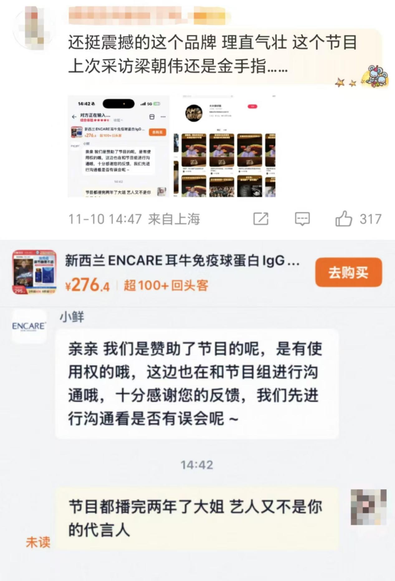 随着舆论升温,在刘嘉玲的评论区内,有网友贴出与店铺客服的对话截图。截图显示,“ENCARE海外旗舰店”曾向消费者解释,“赞助了节目”因而拥有照片使用权,并表示正与节目组沟通,澄清“误会”。
