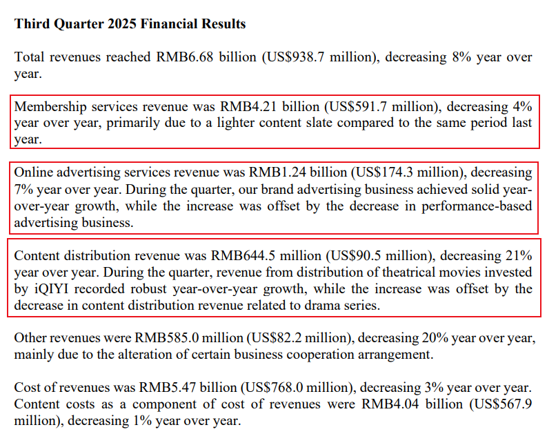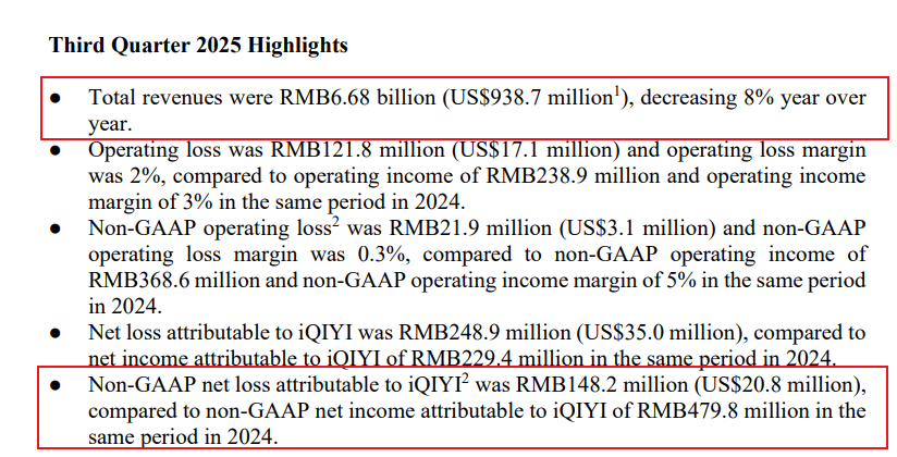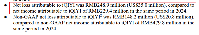回溯过往数据,2025年第二季度爱奇艺已出现约1.34亿元的归母净亏损,而2024年同期净利润为约0.69亿元。